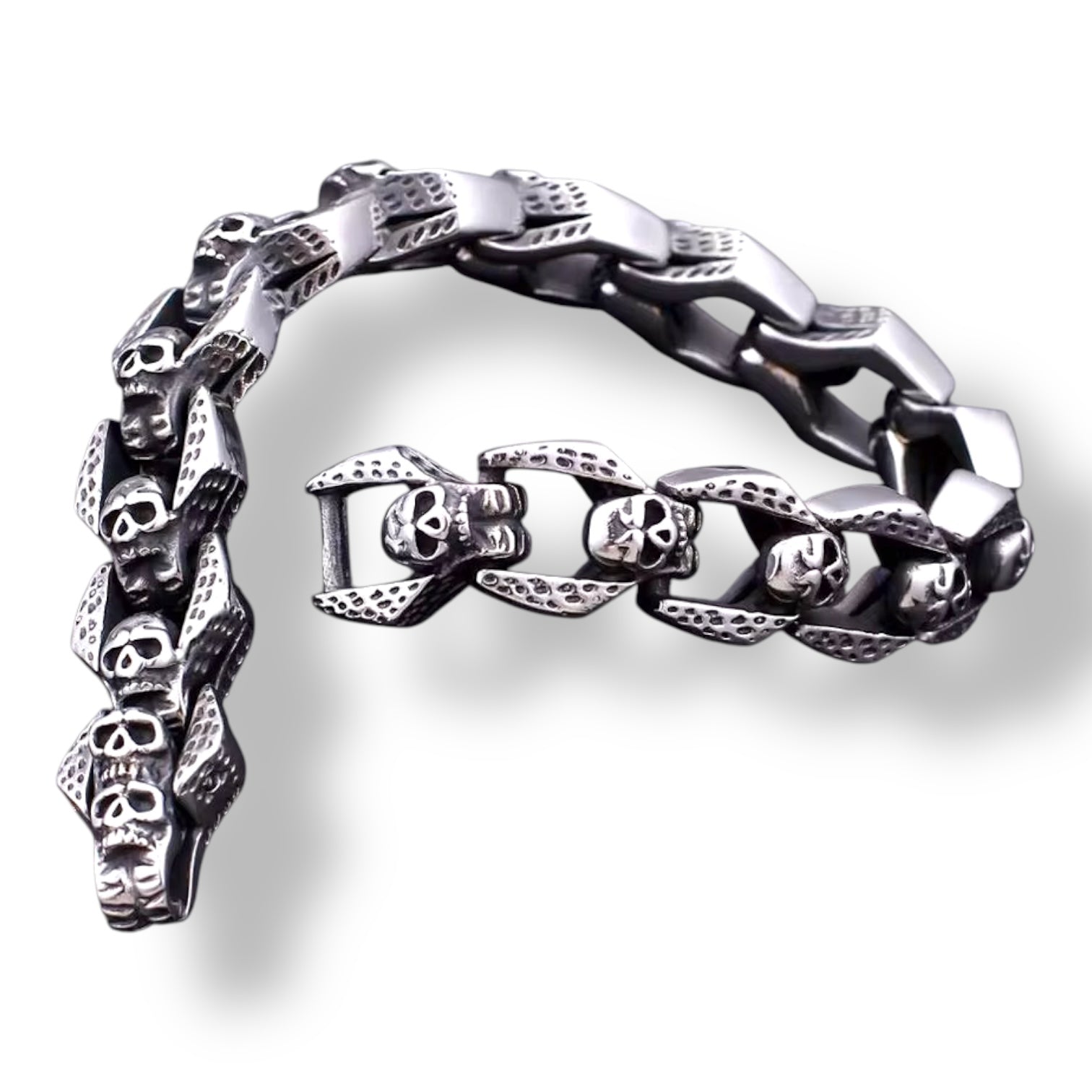 Deze stijlvolle skulls armband is gemaakt van hoogwaardig 316L roestvrij staal. Met een kettinglengte van 22 cm en een kettingbreedte van 1,7 cm biedt deze armband een perfecte balans tussen duurzaamheid en comfort. De armband is voorzien van een toggle-sluiting en een schakelketting, wat zorgt voor een stevige en veilige pasvorm. Voeg een edgy touch toe aan je look met deze robuuste en trendy armband.