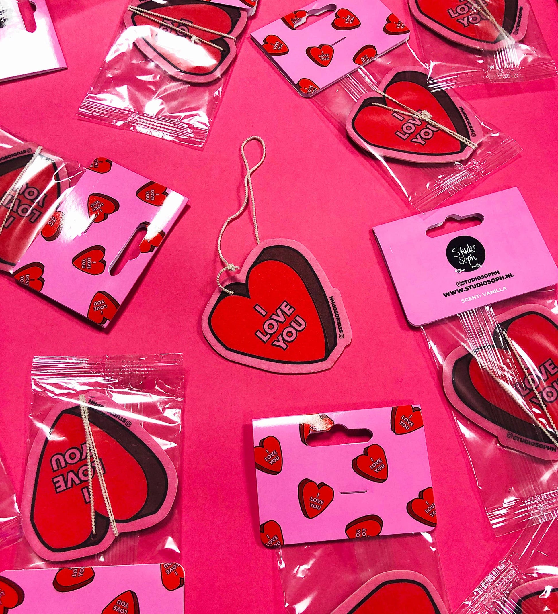 I Love You Air Freshener. 💖 Deze luchtverfrisser is perfect voor je auto, kamer of andere ruimtes voor een aangename geur! Ook een superleuk cadeau om aan je vrienden, familie of collega’s te geven! Geur: Vanilla - Afmetingen: 7 cm x 8 cm (2,76 inch x 3,15 inch) - Dubbelzijdig - De luchtverfrissers zijn verpakt in een kleine plastic hoesje.
